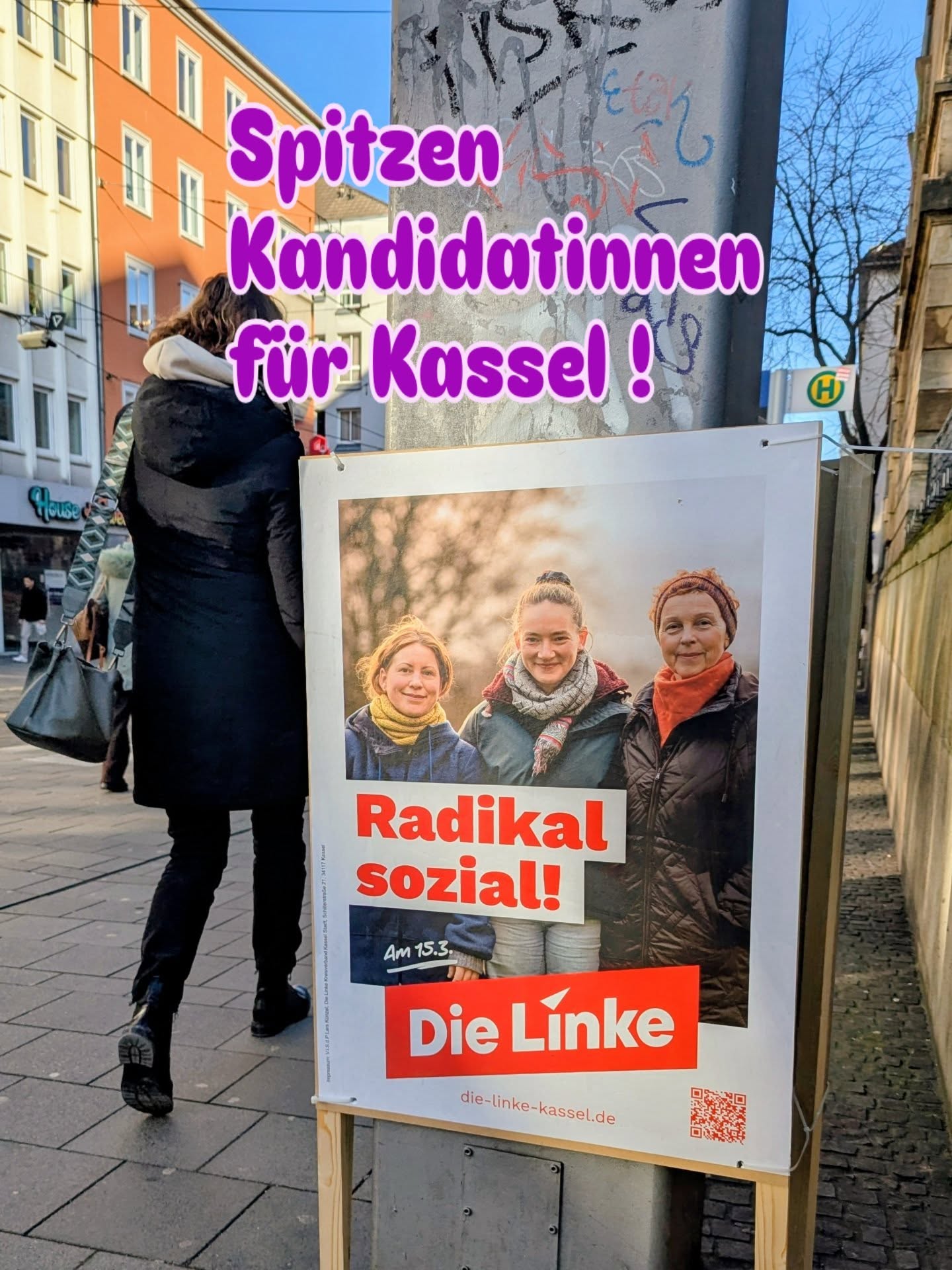 Violetta Bock, Sabine Leidig und Stephanie Schury > 3 Powerfrauen mit viel politischer Erfahrung, Herz und Verstand! ❤️🪩 Ab sofort hängen unsere Plakate in der Innenstadt, der Kommunalwahlkampf ist im vollem Gange … Unser Wahlprogramm findet ihr auf den Webseiten des Linken Kreisverbands Kassel, uns findet ihr im Parteibüro, im Rathaus oder auf der Straße!